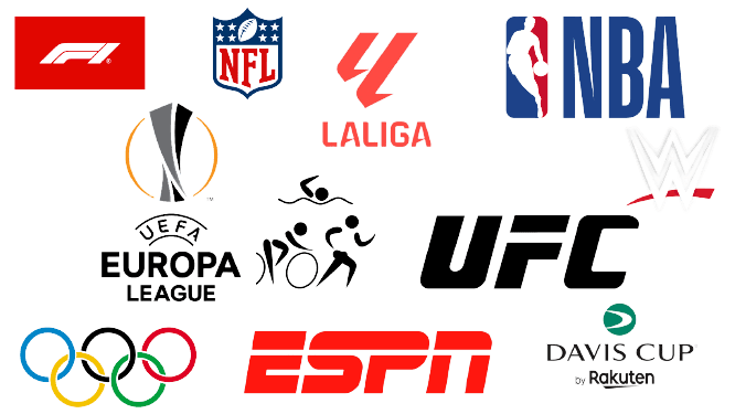 - كرة القدم, كرة السلة, الملاكمة، المصارعة, سباق السيارات، الدراجات النارية